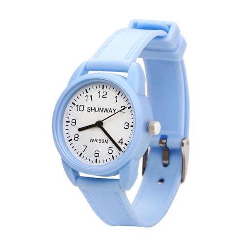 Relógio S582-08-1 Relógio de pulso analógico com design simples e moderno na cor azul claro. Possui mostrador com números grandes de fácil leitura, ponteiros precisos e pulseira confortável em silicone. Ideal para uso diário, combinando estilo leve e praticidade. Resistente à água até 50 metros, adequado para atividades do dia a dia. Funcionamento por bateria. Marca: Não Informado