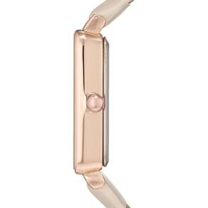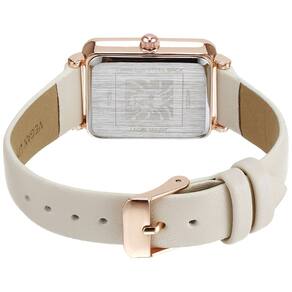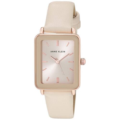 Relógio feminino com pulseira Anne Klein, AK/3702 — Lente de cristal mineral — Mostrador solar em cor creme com ponteiros e marcadores em tom de ouro rosa — Pulseira de couro sintético de cor creme com fecho de fivela — Não é resistente à água