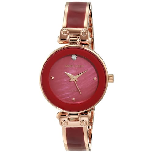 Relógio feminino genuíno com mostrador de diamante Anne Klein - lente de cristal mineral - mostrador em madrepérola cor de vinho com diamante genuíno a 12; ponteiros e marcadores em ouro rosa - pulseira em tom de ouro rosa com enchimento de esmalte cor de vinho; elos ajustáveis; fecho e extensor de joias - Resistente à água até 99 pés (30 m).
