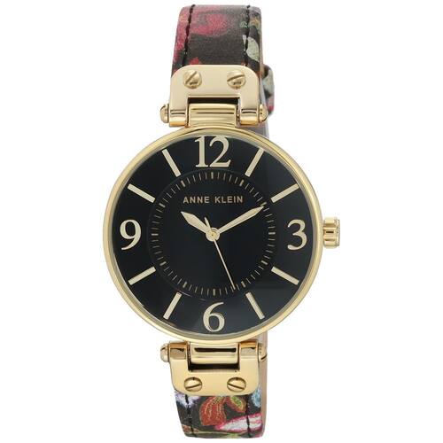Relógio feminino Anne Klein com pulseira de couro — lente de cristal mineral — mostrador preto brilhante com ponteiros e marcadores dourados; faixa de minutos interna — pulseira de couro preta com design floral; fecho de fivela — Resistente à água até 100 pés (30 m)