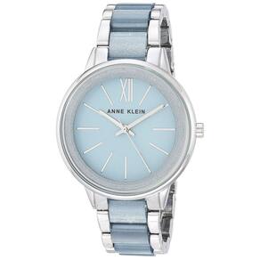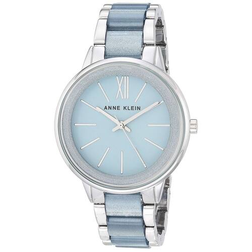 Anne Klein Relógio feminino com pulseira de resina, Azul claro/prata, AK/1413LBSV - Lente de cristal mineral ligeiramente abobadada; mostrador azul claro brilhante com ponteiros e marcadores prateados - Pulseira de elos ajustáveis em tom prateado com elos centrais de resina azul claro; fecho e extensor de joias - Movimento de quartzo japonês - Diâmetro da caixa: 37 mm - Resistente à água até 30 m: em geral, resiste a respingos ou breve imersão em água, mas não é adequado para nadar ou tomar banho