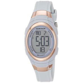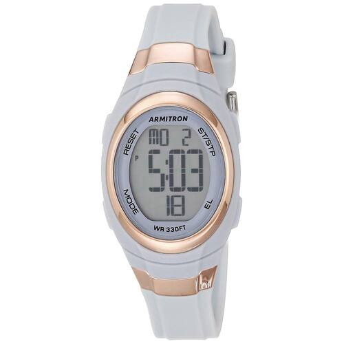 Relógio feminino Armitron Sport 45/7034PBL com detalhes em ouro rosa; display LCD com hora, segundos, dia e data; pulseira de resina azul fosca com anel superior em tom de ouro rosa; display LCD com hora, segundos, dia e data; pulseira de resina azul fosca com fecho de fivela - As funções incluem: cronógrafo, alarme, horário duplo e luz de fundo - Movimento de quartzo - Diâmetro da caixa: 25 milímetros - Resistente à água até 100 metros (330 pés): em geral, adequado para natação e mergulho, mas não para mergulho