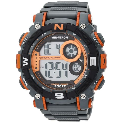 Relógio masculino Armitron Sport com pulseira de resina digital, 40/8284 - Relógio esportivo com pulseira texturizada, várias telas e contrastes vermelhos - Movimento de quartzo com display digital - Janela protetora de cristal acrílico - Possui cronógrafo com hora da volta, hora do alarme, hora dupla, horário militar e funções de luz de fundo, tela LCD de duas zonas com submostradores, incluindo dia, data, hora e segundos, e fecho de fivela - Resistente à água até 330 pés (100 m): adequado para mergulho com snorkel e natação, mas não para mergulho