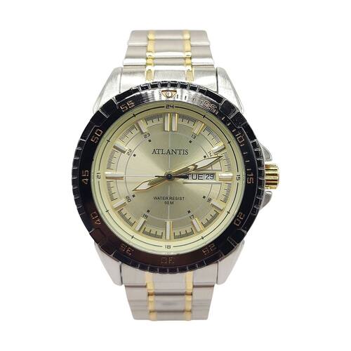 ESPECIFICAÇÕES DO RELÓGIO DE PULSO ATLANTIS SOCIAL MISTO MASCULINO RESISTENTE À ÁGUA: MARCA: Atlantis Sports MODELO: G3392/Atlantis autêntico/Masculino/Analógico/Social/Prático/Moderno/Misto prata e dourado GÊNERO: Masculino COR DA CAIXA: Prateado com detalhe Dourado e Preto COR DO RELÓGIO: Misto COR DO MOSTRADOR: Preto ou Dourado ou Prata MATERIAL DA PULSEIRA: Metal MATERIAL DA CAIXA: Metal MODELO DO FECHO: Fivela Dobrável TIPO DE MOVIMENTO: Bateria TIPO DE VIDRO: Vidro Mineral TAMANHO DA CAIXA INCLUÍDO A COROA: 46mm ESPESSURA: 1cm É RESISTENTE À ÁGUA? Sim É ADEQUADO PARA MERGULHO? Não PROFUNDIDADE DE RESISTÊNCIA À ÁGUA: 50 Metros