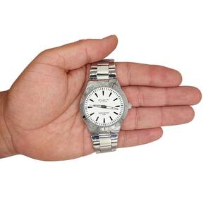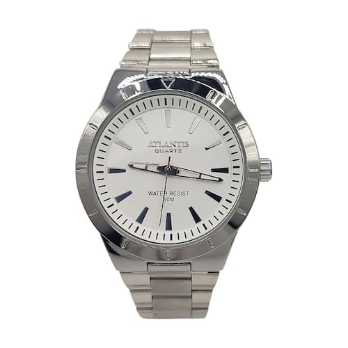 ESPECIFICAÇÕES DO RELÓGIO DE PULSO ATLANTIS SOCIAL PRATEADO MASCULINO RESISTENTE À ÁGUA: MARCA: Atlantis Sports MODELO: G3392/Atlantis autêntico/Masculino/Analógico/Social/Prático/Moderno/ GÊNERO: Masculino COR DA CAIXA: Prateado com detalhe Preto COR DO RELÓGIO: Prata COR DO MOSTRADOR: Preto ou Prata MATERIAL DA PULSEIRA: Metal MATERIAL DA CAIXA: Metal MODELO DO FECHO: Fivela Dobrável TIPO DE MOVIMENTO: Bateria TIPO DE VIDRO: Vidro Mineral TAMANHO DA CAIXA INCLUÍDO A COROA: 46mm ESPESSURA: 1cm É RESISTENTE À ÁGUA? Sim É ADEQUADO PARA MERGULHO? Não PROFUNDIDADE DE RESISTÊNCIA À ÁGUA: 50 Metros