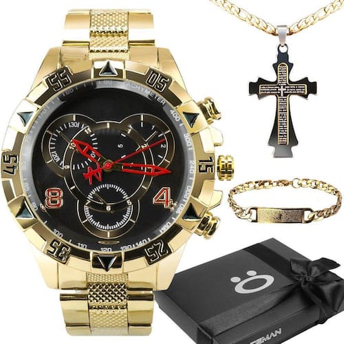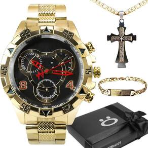 Relogio banhado cruz prova dagua + pulseira + caixa casual pesado social grande ouro presente Kit Luxuoso Masculino Dourado - Relógio, Corrente, Pulseira e Caixa Premium