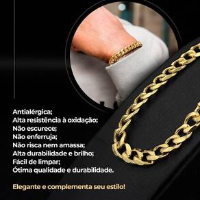 - Pulseira Grumet Banhada em Aço Inoxidável: Com aproximadamente 25cm de comprimento, complementa o conjunto de forma magistral, conferindo uma aparência completa e sofisticada.