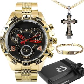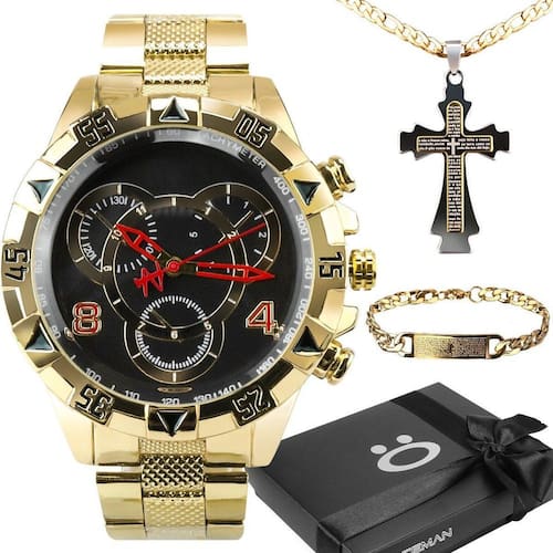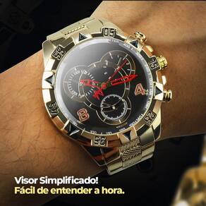 - Relógio Masculino Dourado à Prova d'Água em Aço Inoxidável: Conquiste atenção e destaque com este relógio dourado deslumbrante, perfeito para qualquer ocasião. Resistente à água e feito em aço inoxidável de alta qualidade.