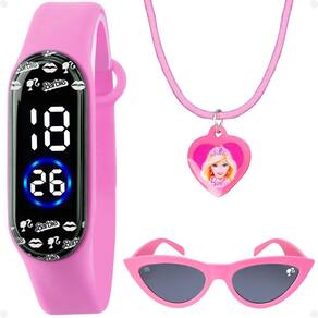 Relogio Barbie Infantil Digital + Oculos Proteção Uv + Colar Pulseira Ajustavel Menina Rosa kit Estilo e Diversão Barbie - Para Crianças a Partir de 5 Anos
