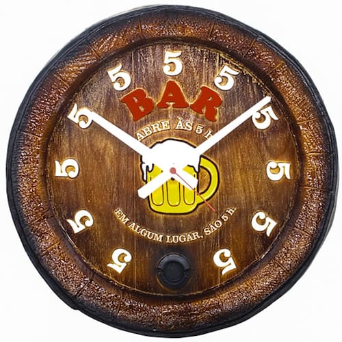 Relógio Barril decorativo BAR. Seu miolo com os dizeres: BAR abre às 5h - Em algum lugar são 5h - e tem seus marcadores apenas com os números 5, além do caneco de Chopp amarelo no meio. O Relógio Barril decorativo é confeccionado em fibra de vidro, simula de forma realista a tampa de um barril de madeira de carvalho com um relógio. Uma peça funcional e muito bonita. Ideal para decoração de bares, churrasqueiras, espaço Gourmet, salão de festas e decoração em casa. Tem o diâmetro de 42 cm de diâmetro por 7 de altura. Essa peça é para ser pendurada na parede. Produzida artesanalmente, uma a uma é pintada nos mínimos detalhes à mão com tintas de alta qualidade e cores vibrante. Máquina do relógio com a qualidade Quatz. O resultado é um presente de indiscutível qualidade e único ideal para homens. Peça colecionável e decorativa. Decore com estilo e bom gosto ambientes como estúdios, barzinhos, restaurantes, salas e churrasqueiras. É um verdadeiro presente para ser lembrado! Ean: 7898574060413