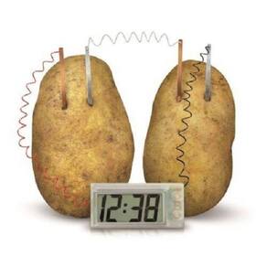 Descubra como funciona um relógio sem pilhas ou baterias. Seja você um cientista e descubra como fazer um relógio digital funcionar utilizando batatas. As placas de metal e as batatas fazem uma simples bateria que gera a eletricidade para o relógio funcionar. Cada batata funciona como um dispositivo chamado célula eletroquímica. Ele converte a energia química armazenada nas tiras de metal em energia elétrica. Duas batatas são necessárias para produzir eletricidade forte o suficiente para abastecer o relógio. A bateria funciona por causa das propriedades químicas dos metais no interior neste caso, o cobre e o zinco . As propriedades diferentes fazem com que minúsculas partículas carregadas de eletricidade chamados íons se desloquem entre as duas chapas de metal. Este fluxo é uma corrente elétrica. A batata contém partículas que permitem o fluxo de corrente. A corrente elétrica também flui ao longo dos fios entre as placas de zinco, de cobre e do relógio. Essa corrente faz com que o relógio funcione. Outros experimentos: Ponha um pouco de refrigerante nos potes fornecidos. Insira as placas de cobre e de zinco nos potes, Siga as instruções do manual , tomando cuidado para que as placas de metal não se toquem. O relógio deve agora começar a funcionar. Você pode experimentar com diferentes líquidos como água salgada, sucos de frutas, ou frutas como limão, laranja, tomate, etc. A diversão é ilimitada. Experimente para descobrir que outras substâncias podem fornecer energia a este relógio. Você vai se surpreender. Atenção: Inspiração e diversão em alta voltagem Especificações: Marca: 4M - Idade Recomendada: +8 anos. Itens inclusos: Relógio digital com fios, potes, fio para conexão, fitas transparentes, tiras de cobre e de zinco e instruções detalhadas. Dimensões aproximadas da caixa: 17 x 22 x 6 cm. ATENÇÃO: Observe atentamente a idade recomendada para o brinquedo. Pode conter partes pequenas que podem ser engolidas e perigosas. As fotos são para ilustrar o produto. Certificado INMETRO CE-BRI-INTERTEK-I 00124-19 NM 300/2004. Código do produto: K00-03275. Código de barras EAN: 4893156032751 Marca: Kidzlabs