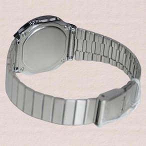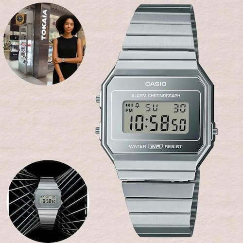 O Casio A700WEV-7A celebra o estilo retrô com elegância minimalista e conforto ultrafino. Com caixa cromada em resina e moldura metálica, ele apresenta uma pulseira em aço inoxidável com fecho ajustável que se adapta perfeitamente ao pulso. O visor digital é protegido por vidro mineral, garantindo durabilidade e clareza. Entre suas funções estão cronômetro de 1/100 de segundo, alarme diário, sinalização horária e calendário automático, todos iluminados pela luz de fundo LED na cor laranja. Leve, confiável e preciso, este modelo é ideal para quem aprecia o design vintage da Casio aliado à funcionalidade moderna e à resistência à água.
