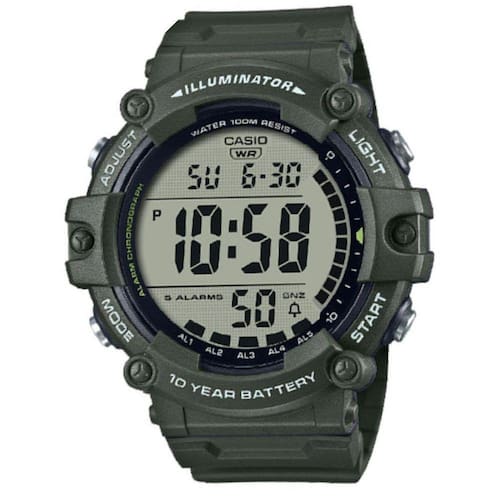 Relógio casio 'bateria 10 anos - verde' ae-1500whx-3avdf Descrição Recursos e informações básicas: - hora mundial: tempo duplo - cronômetro de 1/100 segundo capacidade de medição: 23:59'59,99'' modos de medição: tempo decorrido, tempo parcial, tempos do 1º ao 2º lugar - temporizador de contagem regressiva unidade de medição: 1 segundo faixa de contagem regressiva: 24 horas faixa de configuração da hora de início da contagem regressiva: 1 minuto a 24 horas incrementos de 1 minuto e incrementos de 1 hora Outros: repetição automática - alarme/sinal de hora em hora - 5 alarmes multifuncionais com 1 alarme soneca - luz de fundo led afterglow - cor clara / led: âmbar - calendário automático completo até o ano 2099 - precisão: 30 segundos por mês - formato de 12/24 horas - horário regular: hora, minuto, segundo, pm, mês, data, diaar - vidro de resina - tamanho da caixa l w h : 54,4 51,3 15,8 milímetros - peso: 61g - material da caixa / moldura: resina - pulseira em resina - resistência à água: 100 metros de resistência à água - fonte de alimentação e vida útil da bateria - vida útil da bateria: 10 anos no cr2032 aproximadamente Ean: 4549526324154