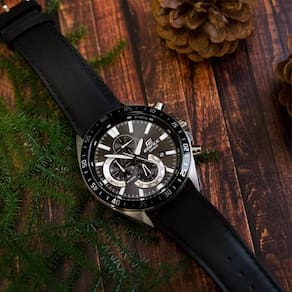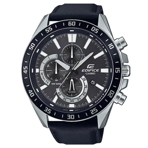 Funções: Visor de data / Cronômetro de 1/10 segundos / Horário regular Analógico: 3 ponteiros (hora, minuto e segundos), 3 mostradores (segundos, minutos e segundos do cronômetro) / Precisão: 20 segundos por mês