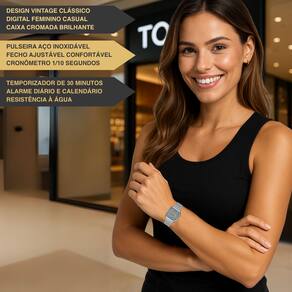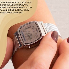O Casio LA670WEM-7DF é um ícone do design retrô feminino. Seu corpo prateado combina caixa em resina cromada e pulseira de malha em aço inoxidável, conferindo leveza e brilho delicado ao pulso. O mostrador digital exibe funções práticas como cronômetro, temporizador, alarme e calendário automático, ideais para o ritmo dinâmico do dia a dia. Com resistência à água e fecho ajustável, o modelo une conforto e durabilidade, tornando-se um acessório versátil para quem valoriza estilo e eficiência. Um clássico da Casio que transcende tendências, elegante em qualquer ocasião.