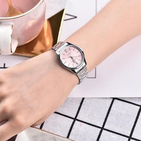 Características Formato do Relógio: Redondo Composição do Vidro: Cristal mineral Material da Caixa: Metal Cor da Caixa: Prata Cor do mostrador: Rosa Material da Pulseira: Aço Inox Cor da Pulseira: Prata Mecanismo: Analógico Quartz