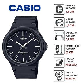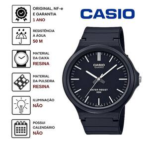 Relógio Casio Unisex Standard Analogico Casual Preto MW-240-1EVDFDescubra o relógio Casio Analógico MW-240, perfeito para o seu dia a dia! Seu design moderno e impactante, com caixa grande e pulseira em resina, oferece estilo e conforto. O vidro com resina protege contra riscos e impactos, oferecendo durabilidade. Com exibição analógica de 3 ponteiros e precisão de ±20 segundos por mês, você sempre saberá as horas com clareza. A bateria dura aproximadamente 3 anos, evitando substituições frequentes. Prático, funcional e confiável, o Casio Analógico MW-240 é a escolha perfeita para você.Recursos:Resistência a água a até 50 metrosEstojo grandeEspecificações:Material do corpo/anel: resinaPulseira em resinaVidro com resinaResistente a água a até 50 mHorário regularAnalógico: 3 ponteiros (hora, minuto, segundo)Precisão: ±20 segundos por mêsDuração aprox. da bateria: 3 anos no SR626SWMedidas:Diâmetro da caixa: 4,8x4,4cmEspessura da caixa: 1,0cmTamanho da pulseira: 21cmLargura da pulseira: 2,1 cmPeso do relógio: 35gConteúdo da Embalagem:Estojo da MarcaAcessórios (correspondentes a cada modelo)Manual em PortuguêsCertificado de 01 ano junto ao FabricanteNota Fiscal EletrônicaO Grupo Casio Brasil assegura o perfeito funcionamento do seu relógio pelo período de 01 ano em todo território nacional, caso o seu produto apresente algum defeito, encaminhe diretamente à assistência técnica mais próxima de sua região, sempre acompanhado da documentação recebida. Ean: 4549526213045