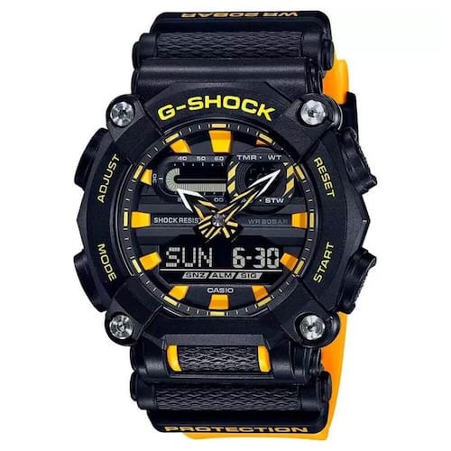 Vidro: Cristal Mineral Material da caixa: Resina Cor da caixa: Preto Material da pulseira: Resina Cor da pulseira: Amarelo Diâmetro da caixa: 49,5 mm Espessura da caixa: 16,9 mm Mecanismo: Anadigi