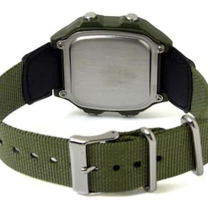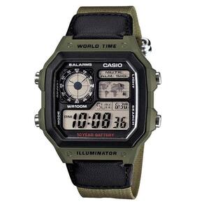 Caixa em Resina Verde Musgo Aro Preto Digital Cronômetro 5 Alarmes Timer Regressivo World Time Pulseira em Nylon Verde Musgo Mapa Com Indicação do País Tipo de Vidro: Acrílico Resistente à Água: 100m Diâmetro da Caixa: Aprox 38mm Espessura da Caixa: Aprox 10mm Garantia de um ano com nota fiscal eletrônica
