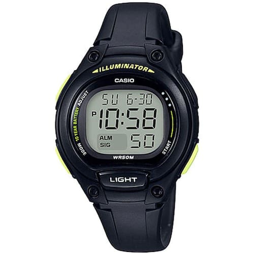 -Gênero: Unissex -Tamanho: Pequeno -Energia do Relógio: Bateria -Mecanismo: Digital -Tempo de Garantia: 12 meses -Material do Relógio: Resina -Cor do Relógio: Preto -Material da Pulseira: Resina -Cor da Pulseira: Preto -Mostrador do Relógio: LCD -Cor do Mostrador: Preto -Tipo de Vidro: Vidro Resina / Vidro Esférico -Resistência a Água: Resistência à água de até 50 metros -Padrão de Iluminação: Fundo luminoso, LED, Duração da iluminação selecionável (1,5 segundo ou 3 segundos), fosforescência -Funções do Relógio: Hora dupla Cronômetro de 1/100 de segundo Capacidade de medição: 23:59'59.99'', Modos de medição: tempo transcorrido, tempo intermediário, tempos do 1º e 2º lugares, Alarme diário, Sinalização a cada hora, Calendário automático completo (até o ano de 2099), Formatos de 12/24 horas, Horário regular: hora, minutos, segundos, pm, mês, data, dia, Precisão: ±20 segundos por mês -Tamanho da caixa : 38,1×34,6×11,3mm -Peso total : 20g