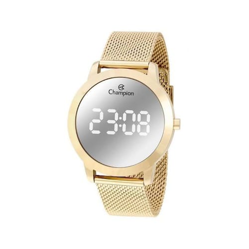 Descrição: - Marca: Champion - Modelo : CH40106B - Gênero: Unissex - Mecanismo: Digital Os dígitos só aparecem quando acionado o botão lateral - Caracteres editáveis - Alimentação: Bateria - Composição do Vidro: Cristal Mineral - Material da Caixa: Metal - Cor da Caixa : Dourado - Material da Pulseira: Aço inoxidável - Co da pulseira : Dourada - Tampa Fundo: Rosqueado - Diâmetro da Caixa: 4,2 cm não contando a coroa - Comprimento do Relógio caixa mais pulseira : 23 cm - Largura da Pulseira : 2,2 cm - Espessura da Caixa: 1,0 cm - Peso do Relógio : 100 g - Resistência à Água: 5 ATM Não é necessário retirar do pulso ao lavar as mãos ou na chuva Não utilizar ao tomar banho e mergulho Características Função : - Hora - Minuto - Mês - Dia do Mês - Caracteres Editáveis - Prazo de : 12 meses Rede de autorizadas Champion A Embalagem Contém : - Um Relógio Champion CH40106B - Certificado de Champion de 1 Ano - Manual - Estojo - Eletrônica Ean: 7891511409559