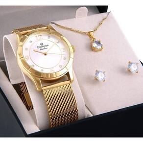 Relógio champion dourado feminino + colar e brincos cn29910w Relógio champion feminino dourado cn29910w acompanha colar e par de brincos folheados com cristais