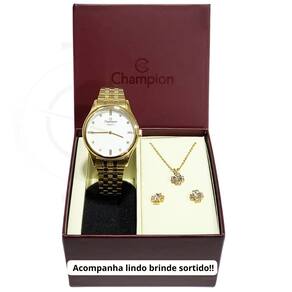 Marca: Champion Modelo: CN25841W Tipo de relógio: Analógico Gênero: Feminino Cor da caixa: Dourado Cor da pulseira: Dourado Estilo: Casual Alarme: Não Cronômetro: Não Calendário: Não Luz: Não Resistência à água: Sim – 5 ATM = 50 metros Tipo de fecho: Dobrável, com trava lateral Material da Caixa: Aço Inoxidável Material da Pulseira: Aço Inoxidável Características do vidro: Cristal Mineral Tamanho da caixa: 34 mm Espessura da caixa: 9 mm Comprimento da pulseira: 23 cm Largura da pulseira: 16 mm Tampa do fundo: Rosqueado Peso: 80 Gramas Alimentação: Bateria Garantia do Fabricante: 12 meses Fabricante: Magnum Indústria da Amazônia S/A