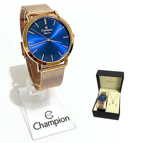 Relógio champion feminino analógico rosé kit cn20819k Cor da correia: rosé Sobre a empresa: = revendedor autorizado = do fabricante = manual de instruções = certificado de = relógio a pronta-entrega Sobre o produto: Kit especial com relógio rosé, caixa em aço, marcadores fundo azul e pulseira em mesh de aço. Acompanha semijoia com colar com pingente de cristal e brinco ponto de luz. Ideal para quem gosta de combinar acessórios. Especificações: Marca: champion Modelo: cn20819k Tipo de relógio: analógico Gênero: feminino Cor da caixa: rosé Cor da pulseira: rosé Estilo: casual Alarme: não Cronômetro: não Calendário: não Luz: não Resistência à água: sim - 5 atm = 50 metros Tipo de fecho: fivela de gancho Material da caixa: aço Material da pulseira: aço Características do vidro: vidro mineral Tamanho da caixa: 40 mm Espessura da caixa: 9 mm Comprimento da pulseira: 23 cm Largura da pulseira: 20 mm Tampa do fundo: rosqueado Peso: 90 gramas Alimentação: bateria do fabricante: 12 meses Fabricante: magnum indústria da amazônia s/a Marca: Não Informado