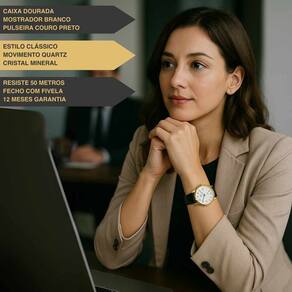 Marca: Champion Modelo: CN28008B Gênero: Feminino Formato: Redondo Mostrador: Analógico Quartz Material da Caixa: Metal Cor da Caixa: Dourado Cor do Mostrador: Branco Vidro: Cristal mineral Pulseira: Couro preto Fecho: Fivela Resistência à Água: 50M (5 ATM)