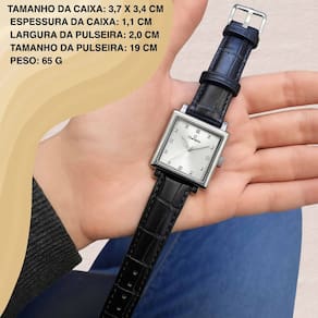 Medidas Tamanho da Caixa: 3,7 x 3,4 cm Espessura da Caixa: 1,1 cm Largura da Pulseira: 2,0 cm Tamanho da Pulseira: 19 cm Peso: 65 g