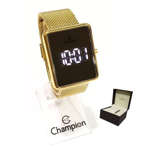 Marca: Champion Modelo: CH40080B Tipo de relógio: Digital Gênero: Feminino Cor da caixa: Dourado Cor da pulseira: Dourado Estilo: Casual Alarme: Não Cronômetro: Não Calendário: Sim Luz: Sim Resistência à água: Sim – 3 ATM = 30 metros Tipo de fecho: Pressão Material da Caixa: Aço Inoxidável Material da Pulseira: Mesh de Aço Inoxidável Características do vidro: Cristal Mineral Tamanho da caixa (A x L): 44 x 37 mm Espessura da caixa: 10 mm Peso: 127 gramas Alimentação: Bateria Garantia do Fabricante: 12 meses Fabricante: Magnum Indústria da Amazônia S/A