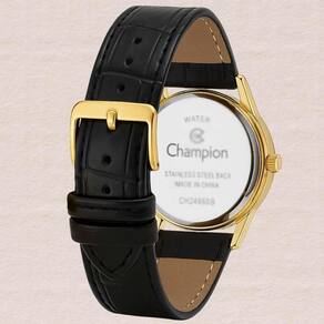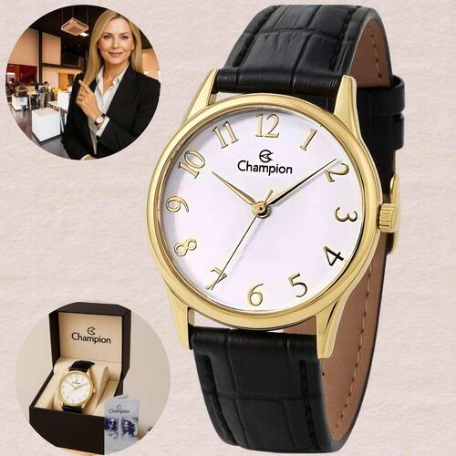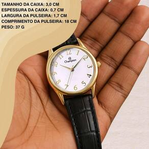 Ficha Técnica Marca: Champion Modelo: CH24660B Referência: Feminino Analógico Material da Caixa: Metal Cor da Caixa: Dourado Mostrador: Branco Cristal: Vidro mineral Pulseira: Couro preto Fecho: Fivela Movimento: Quartzo Resistência à Água: 50 m