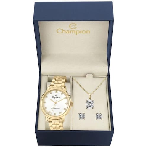 Linha: Elegance Conteúdo da embalagem: 1 relógio, 1 colar, 1 par de brincos, manual, certificado de e Fornecedor: Magnum Indústria da Amazônia S/A Características Vidro: Cristal Mineral Material da caixa: Metal Cor da caixa: Dourado Material da pulseira: Metal Cor da pulseira: Dourado Diâmetro da caixa: 42 mm Mecanismo: Quartz Funções: Analógico Resistência à água 5 atm A resistência deste produto permite apenas respingos de água ao lavar as mãos. Não utilizar este produto em qualquer situação que haja contato direto com água. Ean: 7891511349848