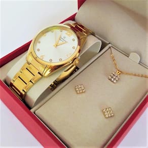 Compre o Relógio Champion Feminino Kit com Colar e Brincos CN25681W. Vamos conhecer um pouco mais sobre o produto Possui mecanismo Analógico, a pulseira é na cor Dourado, fabricada em Aço Inox, com 23 cm de comprimento e possui Fecho Dobrável com Dois Botões. A Caixa, peça onde fica o mostrador, é fabricada em aço inox, mede 4,0 cm de diâmetro, sem considerar a coroa, e 0,9 cm de espessura, o que é considerado tamanho Grande para relógios do gênero Feminino.