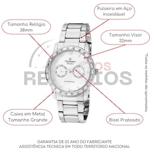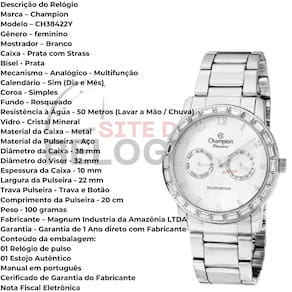 *KIT Colar e Brinco* Descrição do Relógio Marca – Champion Modelo – CH38422Y Gênero – feminino Mostrador – Branco Caixa - Prata com Strass Bísel - Prata Mecanismo – Analógico - Multifunção Calendário – Sim (Dia e Mês) Coroa - Simples Fundo - Rosqueado Resistência à Água - 50 Metros (Lavar a Mão / Chuva) Vidro - Cristal Mineral Material da Caixa – Metal Material da Pulseira – Aço Diâmetro da Caixa - 38 mm Diâmetro do Visor - 32 mm Espessura da Caixa - 10 mm Largura da Pulseira - 22 mm Trava Pulseira - Trava e Botão Comprimento da Pulseira - 20 cm Peso - 100 gramas Fabricante – Magnum Industria da Amazônia LTDA Garantia - Garantia de 1 Ano direto com Fabricante Conteúdo da embalagem: 01 Relógio de pulso 01 Estojo Autêntico Manual em português Cerificado de Garantia do Fabricante procedência garantida Eletrônica