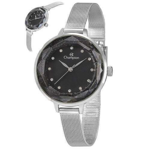 Relógio Champion Feminino Ref: Cf24322t Casual Mesh Prateado DESCRIÇÃO DO PRODUTO: Caixa Em Metal Pulseira Em Malha de Aço Mesh Vidro de Cristal Mineral Bisotê Fundo Rosqueado Resistente à Água 5 Atm Diâmetro / Largura da Caixa: 36.00 MM Funções: Analógico Mostrador preto com pedras Alimentação do Maquinário: Bateria de 1 Ano Marca: Não Informado