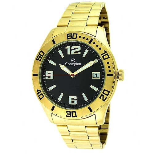 Características Formato do Relógio: Redondo Composição do Vidro: Cristal Mineral Material da Caixa: Aço Inox Cor da Caixa: Dourado Cor do mostrador: Preto Material da Pulseira: Aço Inox Cor da Pulseira: Dourado Mecanismo: Analógico Quartz