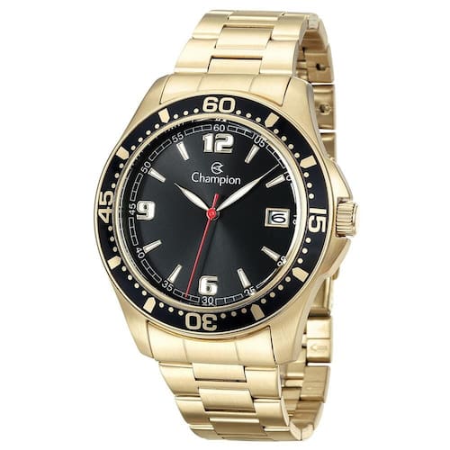 Características Formato do Relógio: Redondo Composição do Vidro: Cristal Mineral Material da Caixa: Aço Inox Cor da Caixa: Dourado Cor do mostrador: Preto Material da Pulseira: Aço Inox Cor da Pulseira: Dourado Mecanismo: Analógico - Quartz