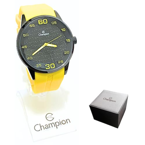 Marca: Champion Modelo: CH30206Y Tipo de relógio: Analógico Gênero: Masculino Cor da caixa: Preto Cor da pulseira: Amarelo Estilo: Casual Alarme: Não Cronômetro: Não Calendário: Não Luz: Não – ponteiros fluorescentes Resistência à água: Sim – 5 ATM = 50 metros Tipo de fecho: Fivela dupla Material da caixa: Aço Material da pulseira: Silicone Características do vidro: Vidro mineral Tamanho da caixa: 45 mm Espessura da caixa: 14 mm Comprimento da pulseira: 25 cm Largura da pulseira: 20 mm Tampa do fundo: Rosqueado Peso: 92 Gramas Alimentação: Bateria Garantia do Fabricante: 12 meses Fabricante: Magnum Indústria da Amazônia S/A