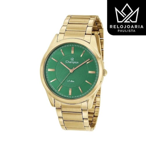 Relógio Champion Masculino Dourado / Verde Slim CN21050G Relógio Champion masculino, dourado, redondo, da linha S-line. Caixa slim, mais fina e visual mais leve. Visor verde com detalhes dourados. Tem nível de resistência à água em 30M/3ATM. Tamanho grande 4,3 cm .