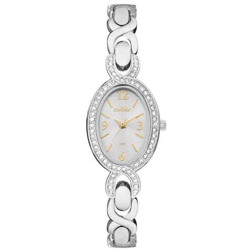 Com caixa oval de 25 mm, o relógio apresenta aro cravejado de cristais reluzentes que destacam o brilho do mostrador prata. Os detalhes em dourado nos números e ponteiros conferem um toque refinado e elegante, trazendo contraste e charme na medida certa.