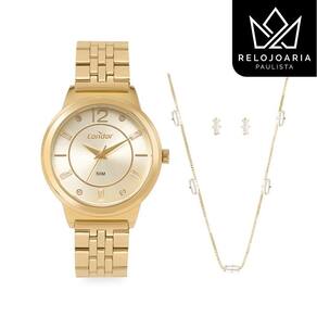 Relógio Condor Feminino Dourado COPC21JFR/K4D Relógio dourado, redondo com maquinismo analógico. Caixa e pulseira em aço com banho dourado. A Coleção Elegante, é para mulheres que gostam de um toque de brilho Com aplicação de cristais em formato de baguete, o modelo traz um detalhe especial para marcar os números no mostrador. Resistência de 5ATM. Acompanha ainda uma linda semijóia colar e brincos , ideal para presentear. Tamanho médio 3,6 cm .