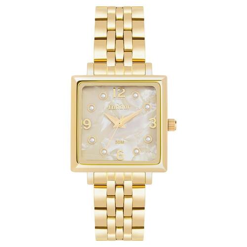Seu mostrador madrepérola em tom perolado, aliado aos índices com detalhes em pedras e números dourados, cria uma harmonia visual luxuosa e feminina. A caixa quadrada de 35 mm confere personalidade e modernidade ao design, enquanto a pulseira de aço dourado com elos polidos e escovados proporciona conforto e brilho na medida certa.