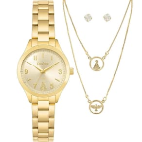 Relógio Condor Feminino Ref: Co2035nig/k4x Dourado Aparecida DESCRIÇÃO DO PRODUTO: Caixa de Metal Pulseira de Aço Vidro de Cristal Mineral Fundo Pressão Resistente à Água 5 Atm Diâmetro / Largura da Caixa: 25.00 MM Alimentação do Maquinário: Bateria Maquina Japonesa Mostrador Dourado com números, pedras e imagem de Nossa Senhora Aparecida + Escapulário Nossa Senhora e Espirito Santo e Par de Brincos Semijóia Tema: Relogioso - Católico de 1 Ano Marca: Não Informado Ean: 7891530848827