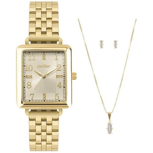 Relógio Condor Feminino Ref: Co2035njn/k4x Dourado + Semijóia DESCRIÇÃO DO PRODUTO: Caixa de Metal Pulseira de Aço Vidro de Cristal Mineral Fundo Pressão Resistente à Água 3 Atm Diâmetro / Largura da Caixa: 28.00 MM x 34.00 MM Alimentação do Maquinário: Bateria Maquina Japonesa Mostrador Dourado com números e pedras + Corrente, Pingente e Par de Brincos Semijóia de 1 Ano Marca: Não Informado Ean: 7891530849763