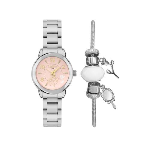 Relógio condor feminino ref: co2035nmy/k4j prateado bela e a fera + semijoia Descrição do produto: Caixa de metal Pulseira de aço Vidro de cristal mineral Fundo pressão Resistente à água 5 atm Diâmetro / largura da caixa: 25.00 mm Alimentação do maquinário: bateria Maquina japonesa Mostrador rosa claro com numeros, pedras e detalhes da personagem bela da animeção a bela e a fera + pulseira e berloques semijóia Produto oficial licenciado disney de 1 ano Marca: Não Informado