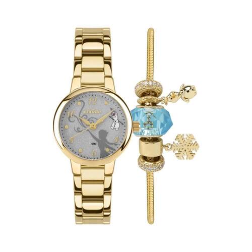 Relógio condor feminino ref: co2035noi/k4k dourado frozen + semijoia Descrição do produto: Caixa de metal Pulseira de aço Vidro de cristal mineral Fundo pressão Resistente à água 5 atm Diâmetro / largura da caixa: 25.00 mm Alimentação do maquinário: bateria Maquina japonesa Mostrador prateado com brilho, numeros e detalhes dos personagens da animeção frozen + pulseira e berloques semijóia Produto oficial licenciado disney de 1 ano