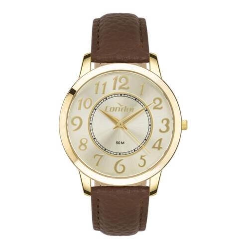 Relógio Condor Feminino Ref: Co2035nqy/3x Casual Dourado DESCRIÇÃO DO PRODUTO: Caixa de Metal Pulseira de material sintético Marrom Vidro de Cristal Mineral Fundo Pressão Resistente à Água 5 Atm Diâmetro / Largura da Caixa: 36.00 MM Alimentação do Maquinário: Bateria Maquina Japonesa Mostrador Dourado com todos os números de 1 Ano Marca: Não Informado