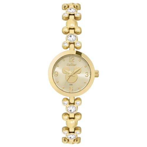 Relógio condor feminino ref: co2035ntf/5x dourado bracelete mickey Descrição do produto: Caixa de metal Pulseira de metal estilo bracelete com pedras Vidro de cristal mineral Fundo pressão Resistente à água 5 atm Diâmetro / largura da caixa: 25.00 mm Alimentação do maquinário: bateria Maquina japonesa Mostrador dourado com numeros, pedras e detalhes do personagem mickey mouse Produto oficial licenciado disney de 1 ano Marca: Não Informado Ean: 7891530875212