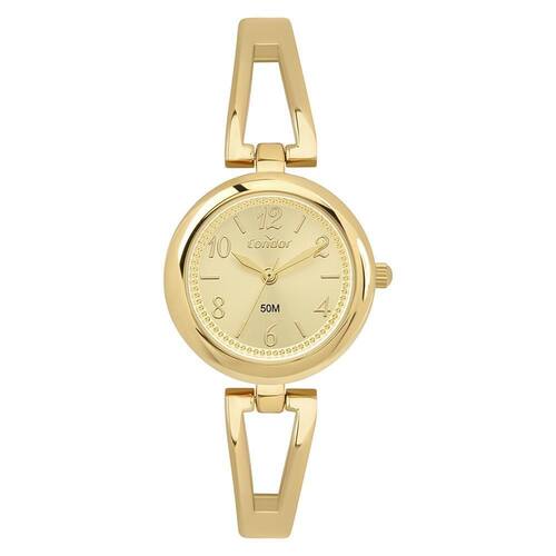 Relógio condor feminino ref: co2035nuj/5x bracelete dourado Descrição do produto: Caixa de metal Pulseira de metal estilo bracelete Vidro de cristal mineral Fundo pressão Resistente à água 5 atm Diâmetro / largura da caixa: 28.00 mm Alimentação do maquinário: bateria Maquina japonesa Mostrador dourado com números e pedras de 1 ano Marca: Não Informado